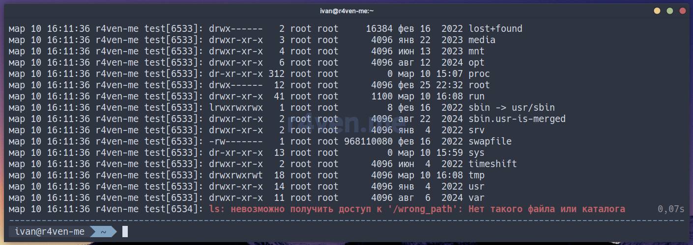 ls: невозможно получить доступ к '/wrong_path': Нет такого файла или каталогаВ первом случае команда вывела информацию в стандартный вывод (stdout), а вторая в стандартный вывод ошибок (stderr). Теперь давайте настроим логирование вывода этих двух потоков.