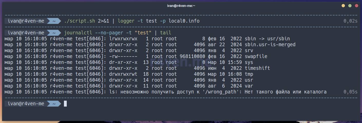 ./script.sh 2>&1 | logger -t test -p local0.infoСмотреть записи в системном журнале можно с помощью утилиты journalctl в случае Journald и cat | less | grep и др. в случае обычных файлов Syslog: