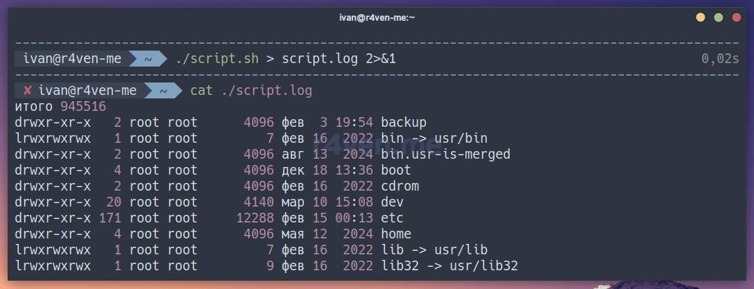 В этот раз вывод скрипт пустой. Все потому, что конструкция > script.log перенаправила стандартный вывод скрипта в указанный файл (в нашем случае script.log), а 2>&1 — перенаправила вывода ошибок в первый дескриптор, которым является стандартный вывод, который в свою очередь записал все в файл.