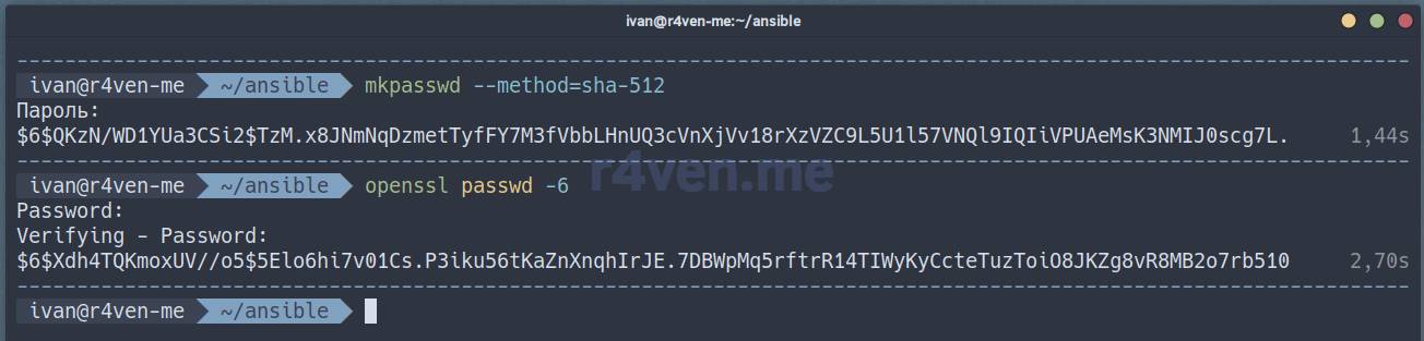 Пароли пользователей вы можете указать явно (ansible все равно сделает из них строку SHA-512 на сервере), но так делать не рекомендуется☝️. Безопаснее всего указать их в виде хэш строки. К слову, аналогичным образом в файле /etc/shadow хранятся пароли локальных пользователей Linux.