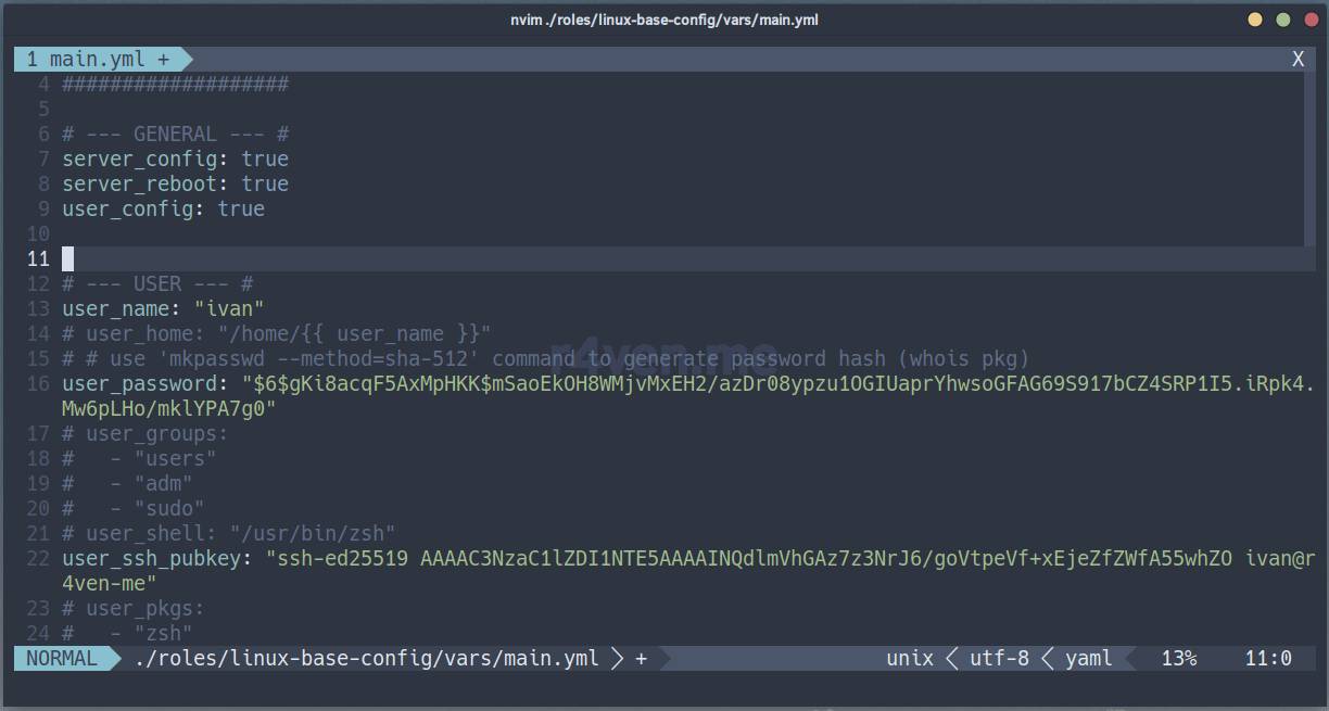 nvim ./roles/linux-base-config/vars/main.ymlВы можете раскоментировать и изменить любые значения, я укажи лишь обязательные.