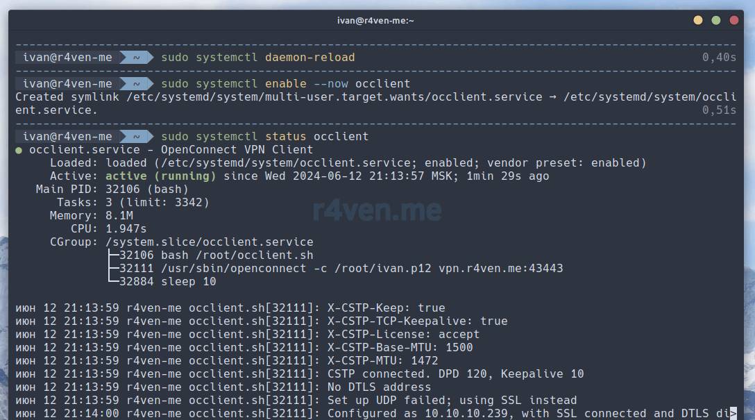 sudo /root/occlient.shЕсли вы все шаги проделали верно, то увидите примерно такую картину: