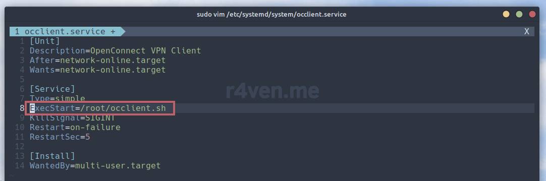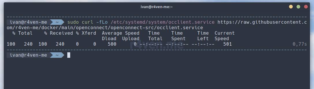 sudo curl -fLo /etc/systemd/system/occlient.service https://raw.githubusercontent.com/r4ven-me/docker/main/openconnect/openconnect-src/occlient.service
