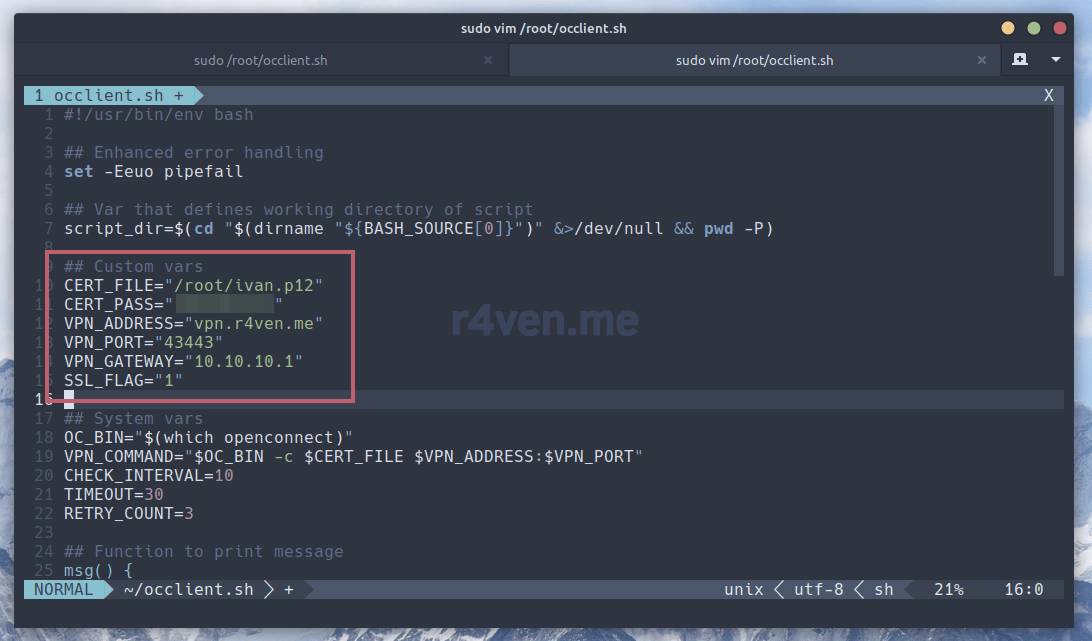 sudo vim /root/occlient.shНа моём сайте также есть цикл статей про этот консольный редактор. Посмотреть список можно по соответствующему тегу: .
