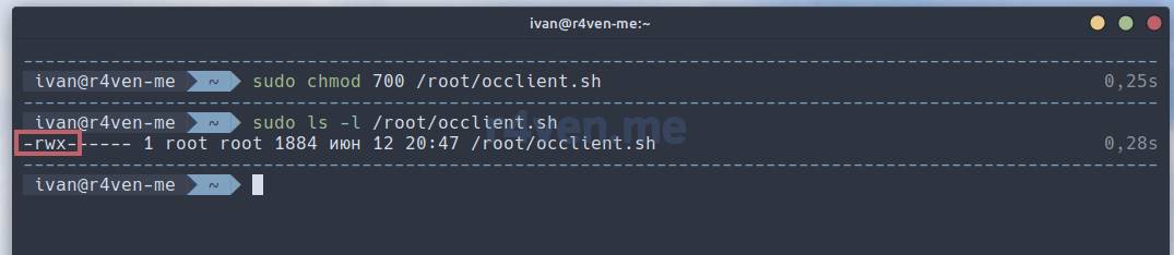 sudo chmod 700 /root/occlient.shПро права на файлы я подробно рассказывал в статье: Командная строка Linux, права на файлы: команды id, chmod, chown.