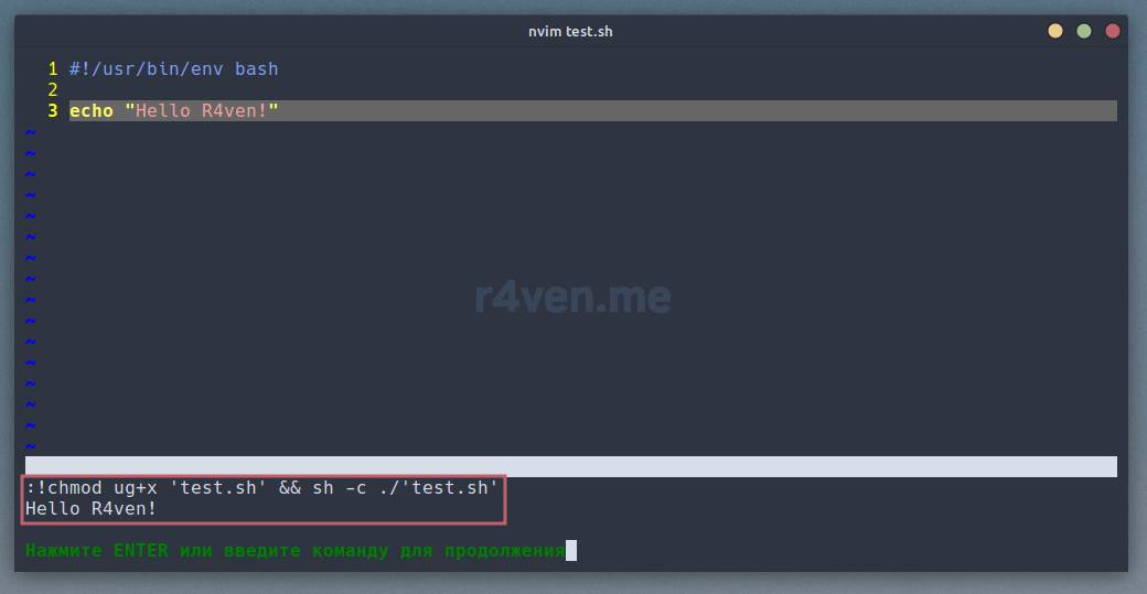 F5 | Назначено выполнение внешней команды для клавиши F5. Эта команда включает в себя использование chmod и запуск текущего редактируемого файла в виде скрипта во всплывающем окне. Однако это действие осуществляется только для файлов с определенными форматами, а именно sh (shell) и py (python). Подробности об этом будут описаны далее. |