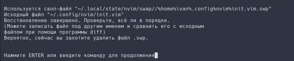 nvim ~/.config/nvim/init.vimИ после появления предупреждения о свап файле нажимаем R для восстановления, затем Enter: