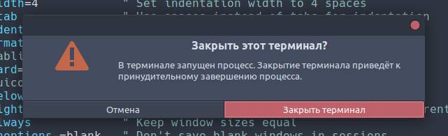 Вернемся в соседнее окно с открытым файлом. В конец файла добавим строку-комментарий (начинается с двойной кавычки ") и не сохраняя файл завершим работы редактора аварийно, например простым закрытием окна терминала: