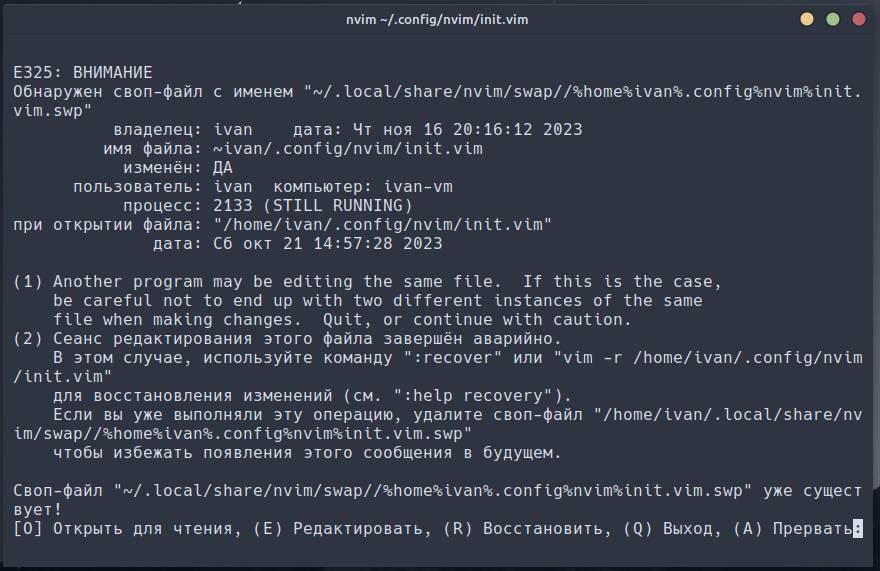 Neovim задетектил наличие swap’а для открываемого файла, что указывает на две ситуации: этот файл был закрыт аварийно, либо в данный момент он используется в другой сессии. Нам предлагают на выбор несколько вариантов: