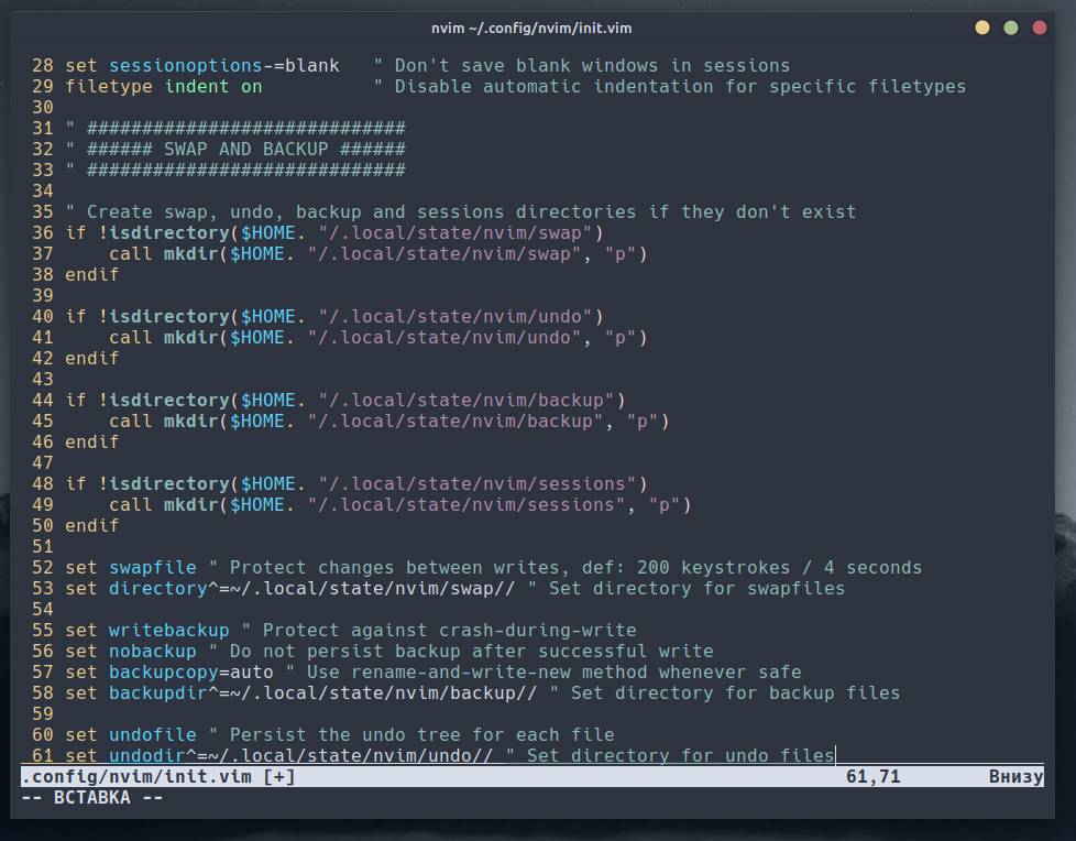 if !isdirectory($HOME. "/.local/state/nvim/backup") call mkdir($HOME. "/.local/state/nvim/backup", "p") endif | Аналогичная проверка и создание каталога для для файлов резервных копий. |