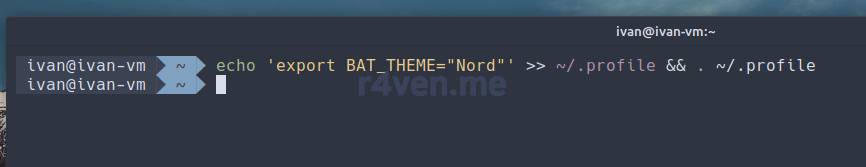 echo 'export BAT_THEME="Nord"' >> ~/.profile && . ~/.profile