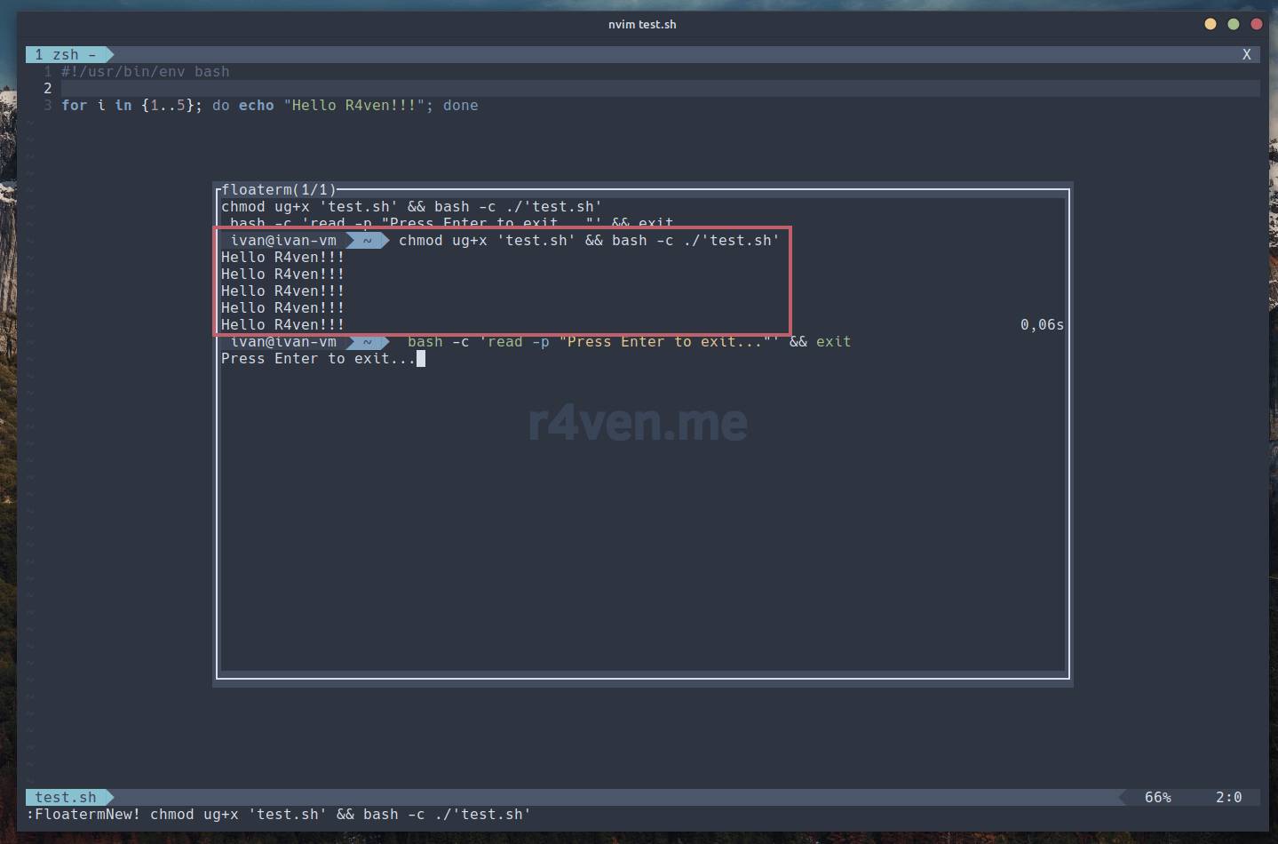 F5у нас забинжено действие запуска текущего файла, как исполняемого, если он имеет расширение.shили.py. Т.к. у нас есть «плавающий терминал», при нажатии F6 текущий файл исполнится во всплывающем окне: