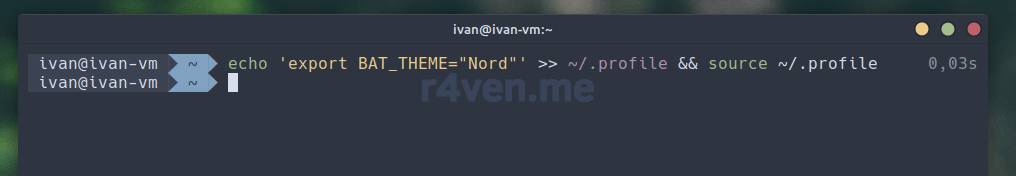 echo 'export BAT_THEME="Nord"' >> ~/.profile && source ~/.profile