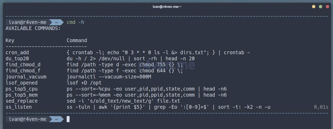 cmd -hИ попробуйте «протабать» команду cmd. К сожалению Bash сможет только вывести список доступных команд, но не переключать их интерактивно, как это умеет Zsh🤷♂️.