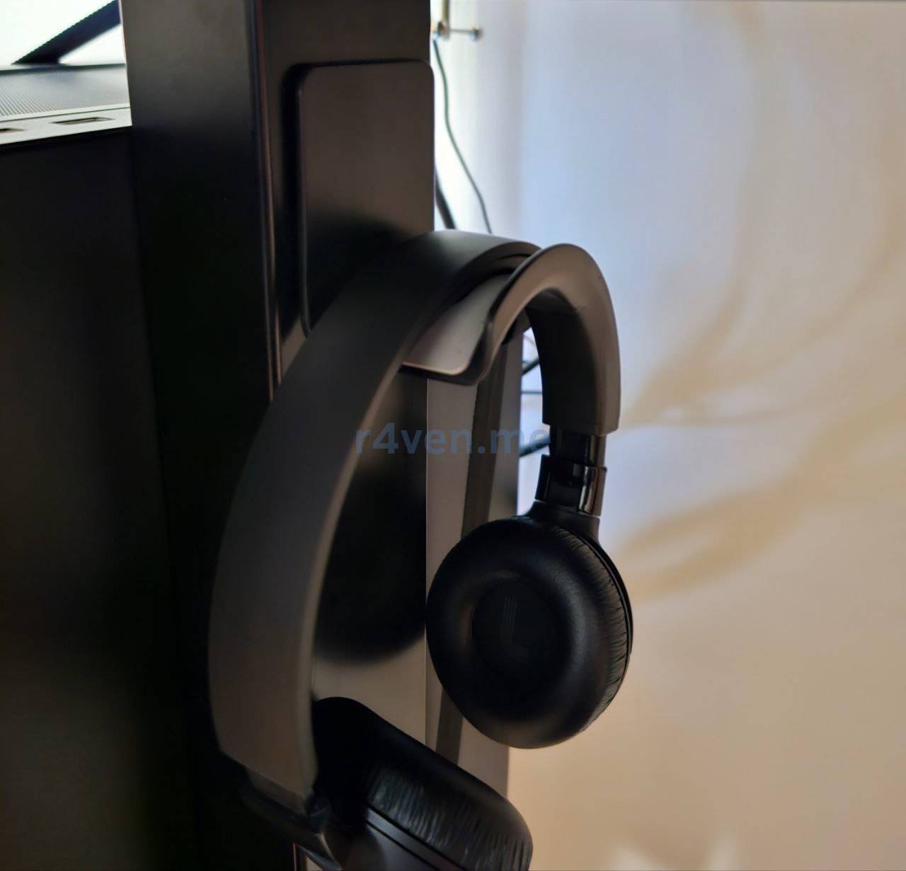 На моём рабочем столе свободного места не так много, поэтому я решил хранить наушники под столом, с помощью такого вот держателя на двустороннем скотче: