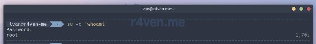 -или-l(login) — имитировать «полноценный» вход под оболочкой пользователя (make the shell a login shell);-c(command) — выполнить переданную далее команду (в кавычках);-g(group) — выполнить подмену группы пользователя, работает только для root.