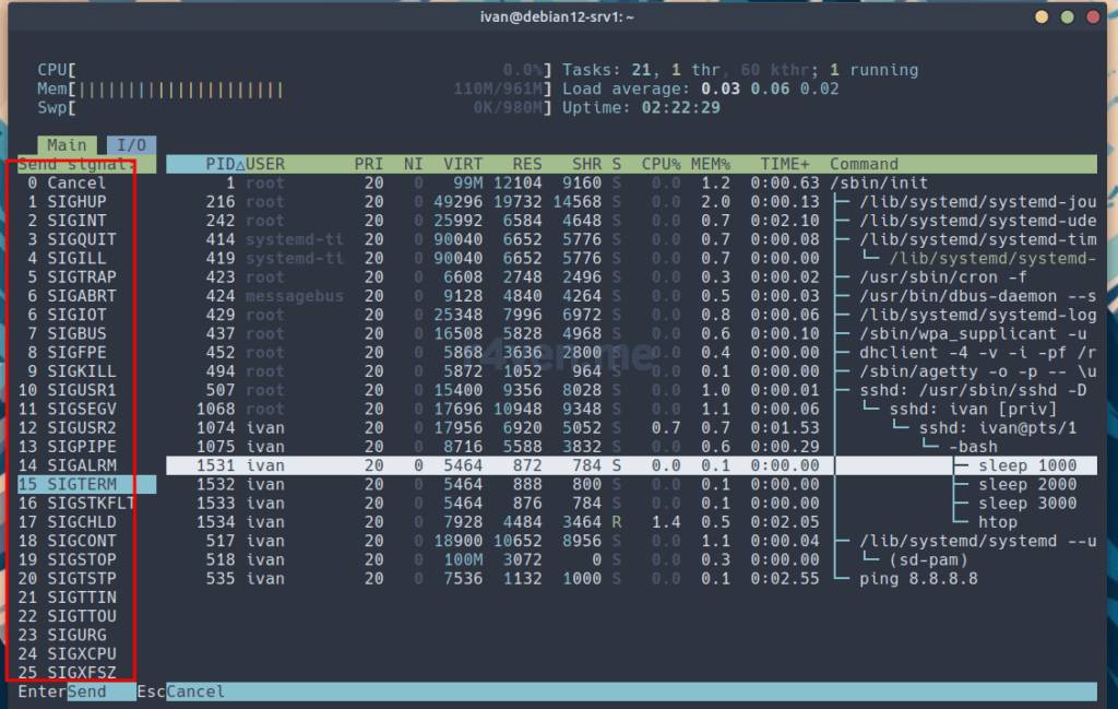Переводим курсор на нужный процесс и нажимаем F9. Слева у нас отобразиться список доступных сигналов для отправки, часть из которых мы с вами рассмотрели ранее: