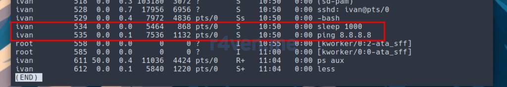 В списке также есть: процесс нашего сеанса оболочки — bash, фоновые команды sleep и ping, а также сама команда ps, которая на момент показа «снимка» процессов также находилась в этом списке.