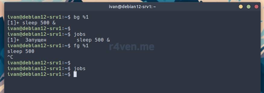 Проверим результат командой jobs, затем выведем процесс на передний план командой fg и завершим его сочетанием клавиш Ctrl+c: