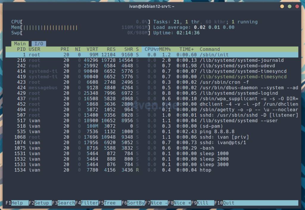 -d <seconds>— задать интервал обновления в секундах;-u <username>— показать только процессы указанного пользователя;-p <PID>— отслеживать только указанный процесс;-s <COLUMN>— сортировать список процессов по указанной колонке;-t— показать процессы в древовидной структуре;-H— показать отдельные потоки вместе с процессами;-M— сортировать процессы по использованию памяти;-P— сортировать процессы по использованию процессора.