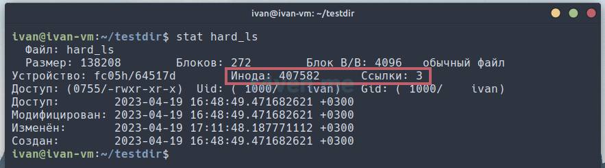 Также обратите внимание на колонку №3 данного вывода: тут указано количество жестких ссылок файла существующих в системе.