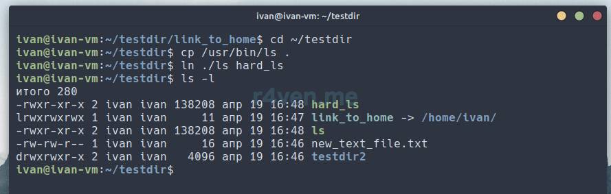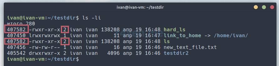 Рассмотрим несколько примеров. Находясь в директории testdir скопируем в нее исполняемый файл команды ls и создадим на него жесткую ссылку с другим именем: