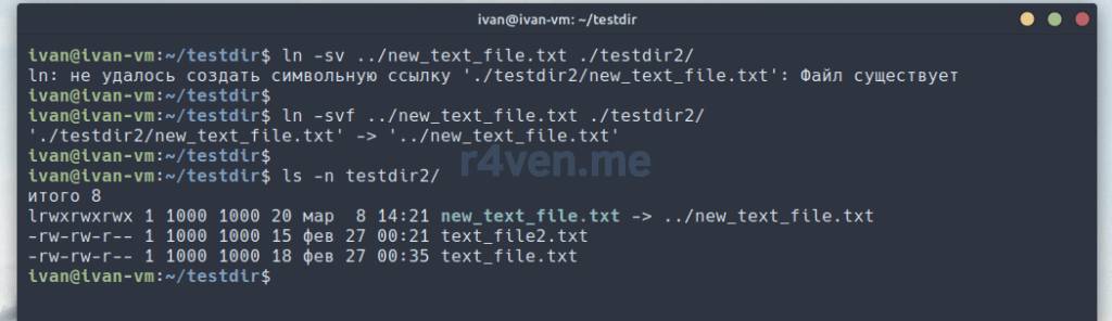 ln -sv ../new_text_file.txt ./testdir2/Увидим ошибку, т.к. файл с таким именем существует. Чтобы перезаписать его используем ключ -f: