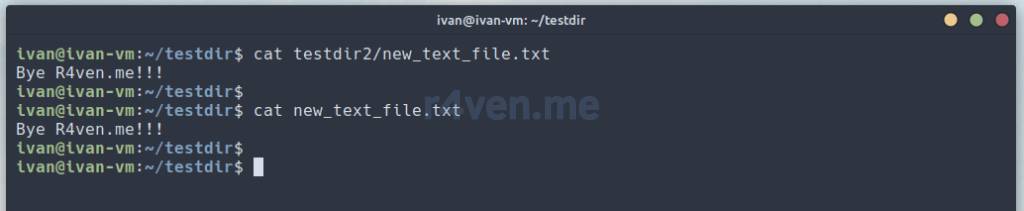 Создаём две директории: testdir и внутри неё testdir2, а также один пустой файл new_text_file.txt, который наполним любым содержимым с помощь графического редактора xed (я добавил строку «Bye R4ven.me!!!»):