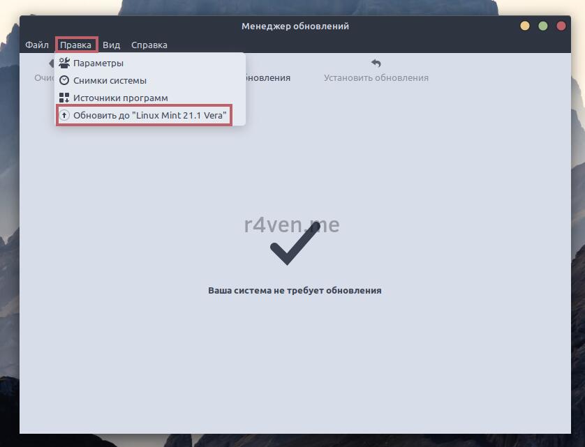 Приступим. Вновь запускаем «Менеджер обновлений«, меню «Правка» и последней строчкой будет пункт: «Обновить до Linux Mint 21.1 Vera«: