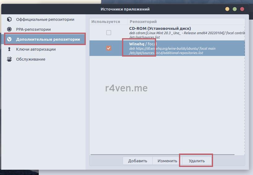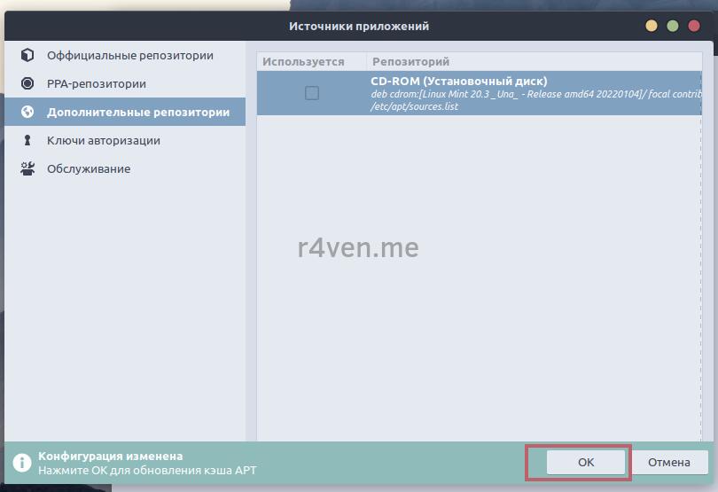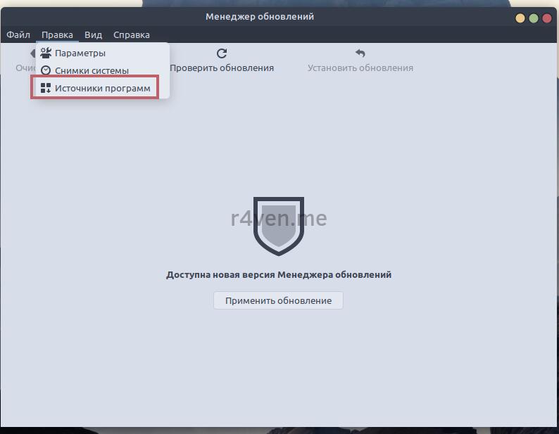 Делается это также через «Менеджер обновлений«, меню «Правка«, пункт «Источники программ«. Тут удаляем дополнительные репозитории, после чего подтверждаем обновление кэша пакетов: