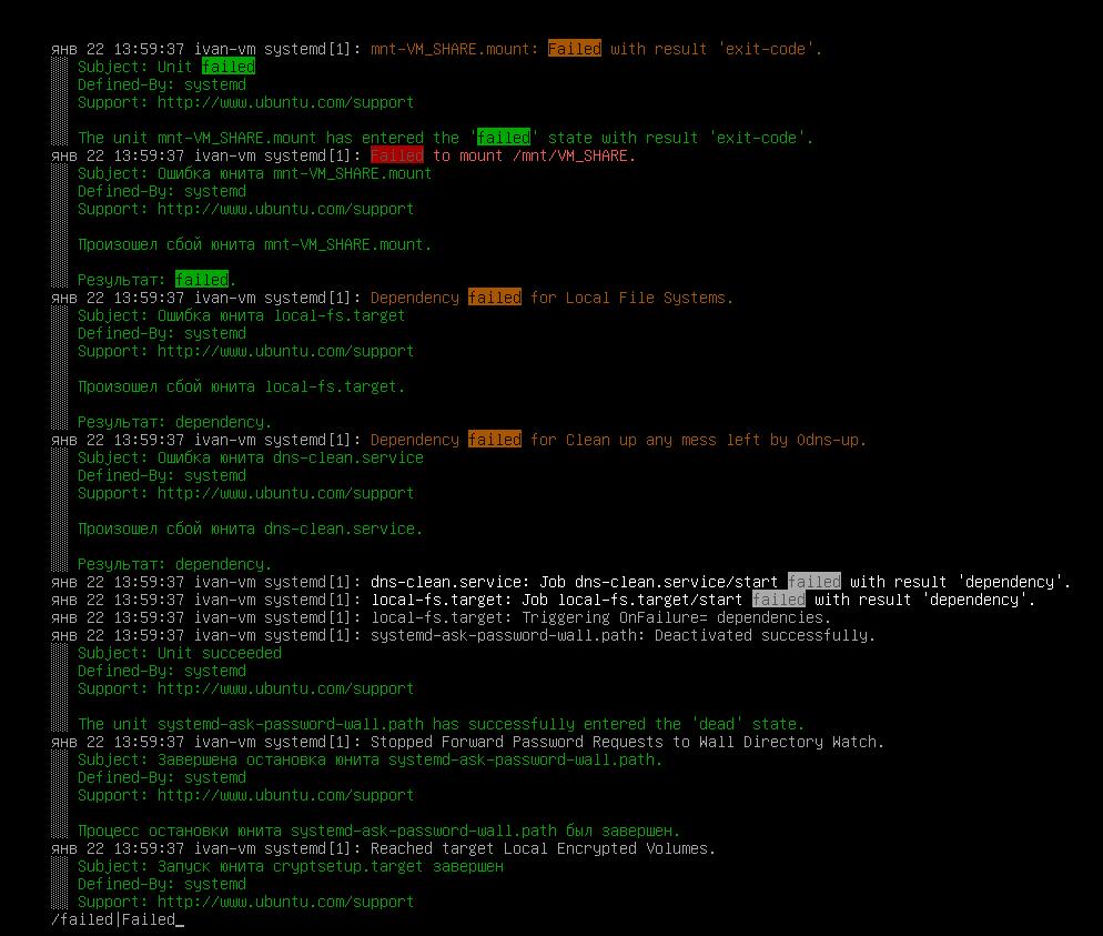 Дабы не читать весь журнал целиком, я выполнил поиск по ключевым словам: error, failed, warning.