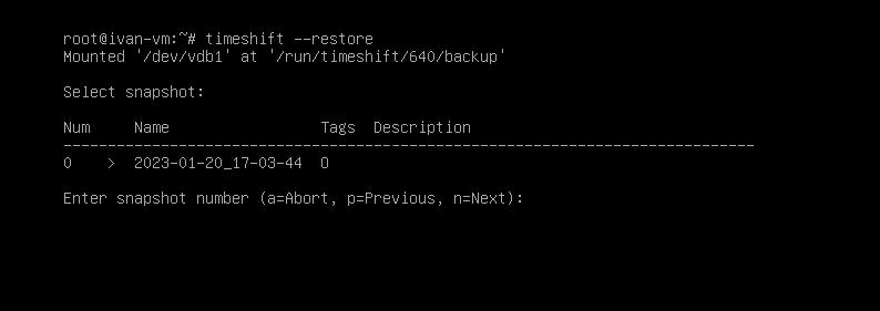 Если вы также попали в аварийную консоль, то для запуска процесса восстановления из резервной копии Timeshift выполните такую команду: