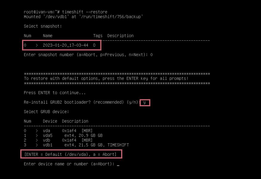Далее в интерактивном режиме выберите номер резервной копии и подтвердите переустановку загрузчика Grub, указав на раздел, где он был у вас установлен ранее (или Enter для выбора значения по умолчанию), обычно это диск или раздел, где установлена сама ОС. Подтвердите отказ от ответственности, после чего запуститься процесс отката системы: