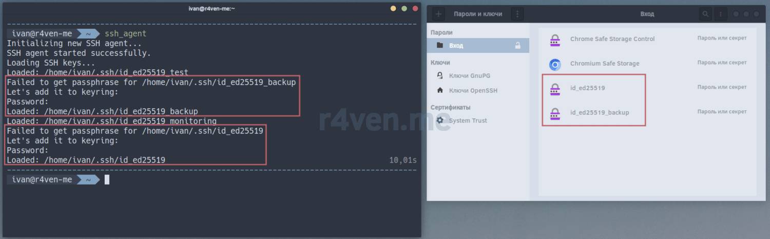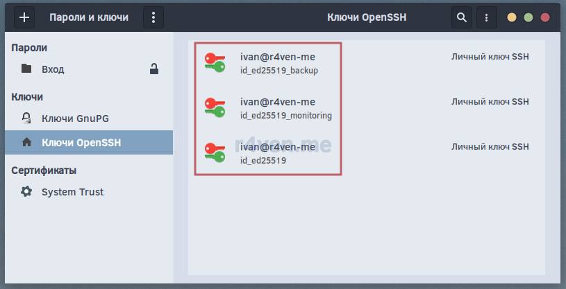 ⚠️Обратите внимание, что скрипт сохраняет пароли в gnome-keyring в разделе « Пароли —> Вход «, а не в « Ключи OpenSSH » — это два разных хранилища!