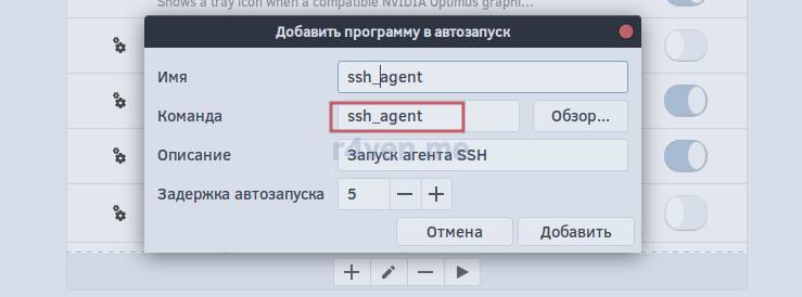 echo '( { sleep 5 && ssh_agent } & ) > /dev/null 2>&1' >> ~/.zshrcИли лучше в настройках системы:
