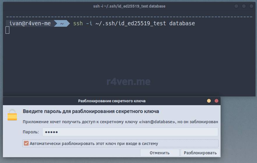 secret-tool store --label=id_ed25519 unique ssh-store:/home/ivan/.ssh/id_ed25519Где в label — указывается имя самого приватного ключа без пути к нему, а в параметре unique наоборот, нужно указать абсолютный путь до файла ключа.