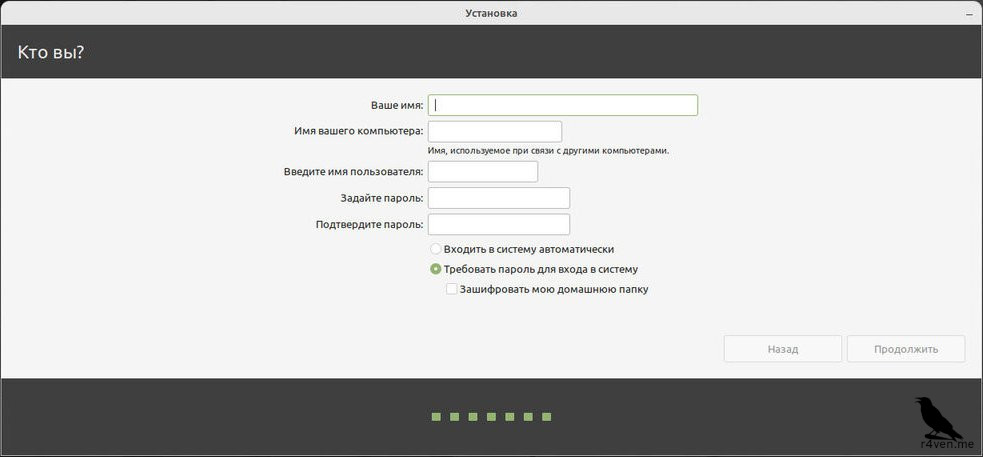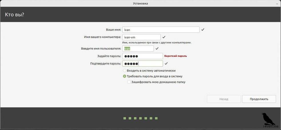 На этом шаге нам необходимо задать имя пользователя и пароль для него. Пустой пароль, как в Windows задать не получится, ввиду идеологии безопасности в Linux.