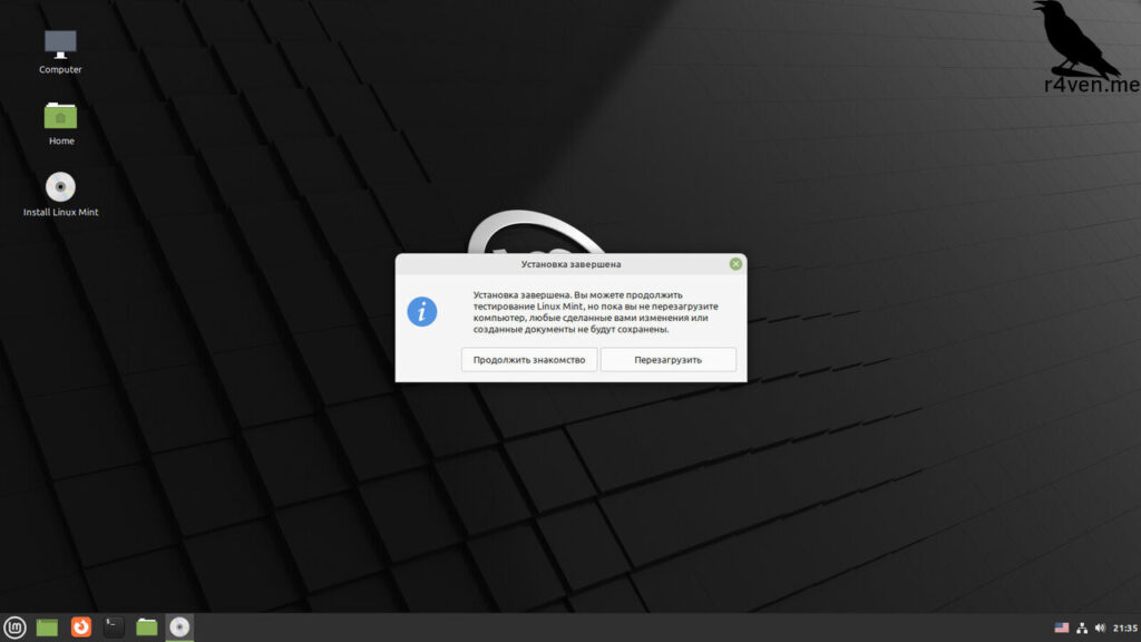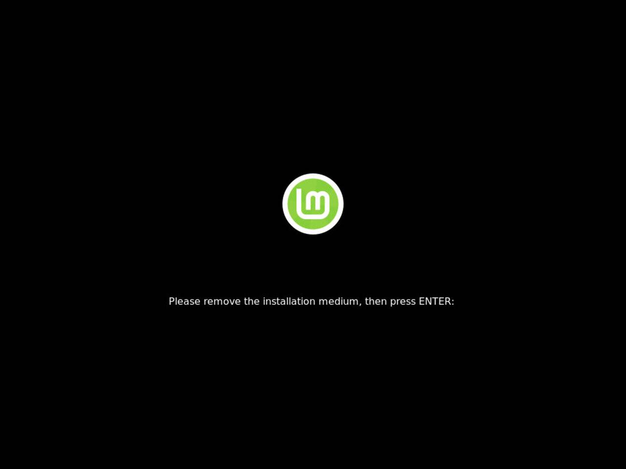 По завершению установки программу уведомит вас об окончании и возможности перезагрузится в только что установленную ОС Linux. После будет предложено извлечь usb накопитель и продолжить нажав Enter.