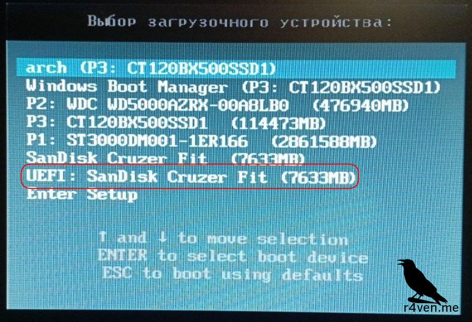 Обратите внимание. Если у вас система с UEFI значит из списка выбирайте вашу флешку с соответствующей приставкой. А если просто BIOS, то вариант будет только один.