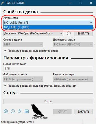 В пункте «Устройство» выбираем наш usb накопитель.