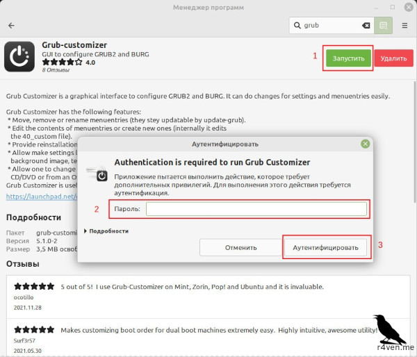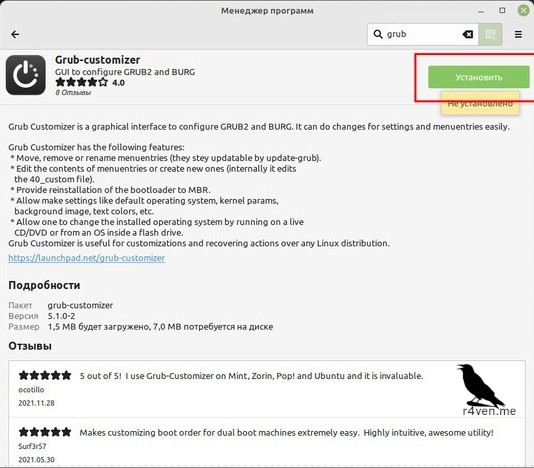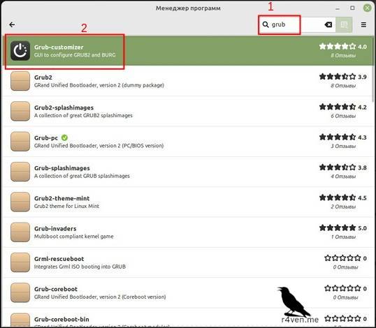 Заходим в менеджер программ (при первом запуске некоторое время займёт создание кэша), вбиваем в поиск «grub», находим в списке «Grub-customizer» и выбираем его: