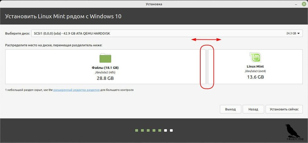 Чтобы указать необходимое пространство в установщике нужно передвинуть мышкой ползунок на схеме разбивки диска. Слева у нас указан раздел с WIndows а справа выделяемое пространство под Linux: