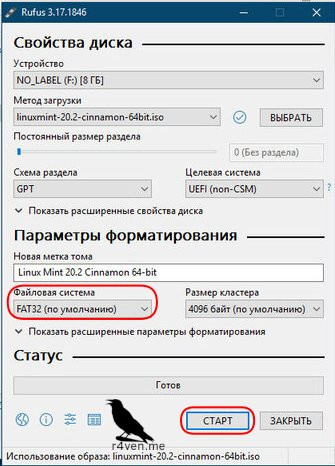 Далее удостоверимся, что для usb накопителя выбрана файловая система FAT32 или NTFS и жмакаем на кнопку СТАРТ: