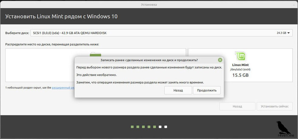 При выборе типа установки, как в шаге выше установщик сам выделит и разметит указанное дисковое пространство под систему. Нам остаётся лишь указать выделяемый размер. Я рекомендую выделить не менее 15-20 гигабайт, для полноценной работы Linux Mint. По возможности, стоит выделить хотя бы 50 гб. По сути предела нет. Больше — лучше, в зависимости от ваших планов.
