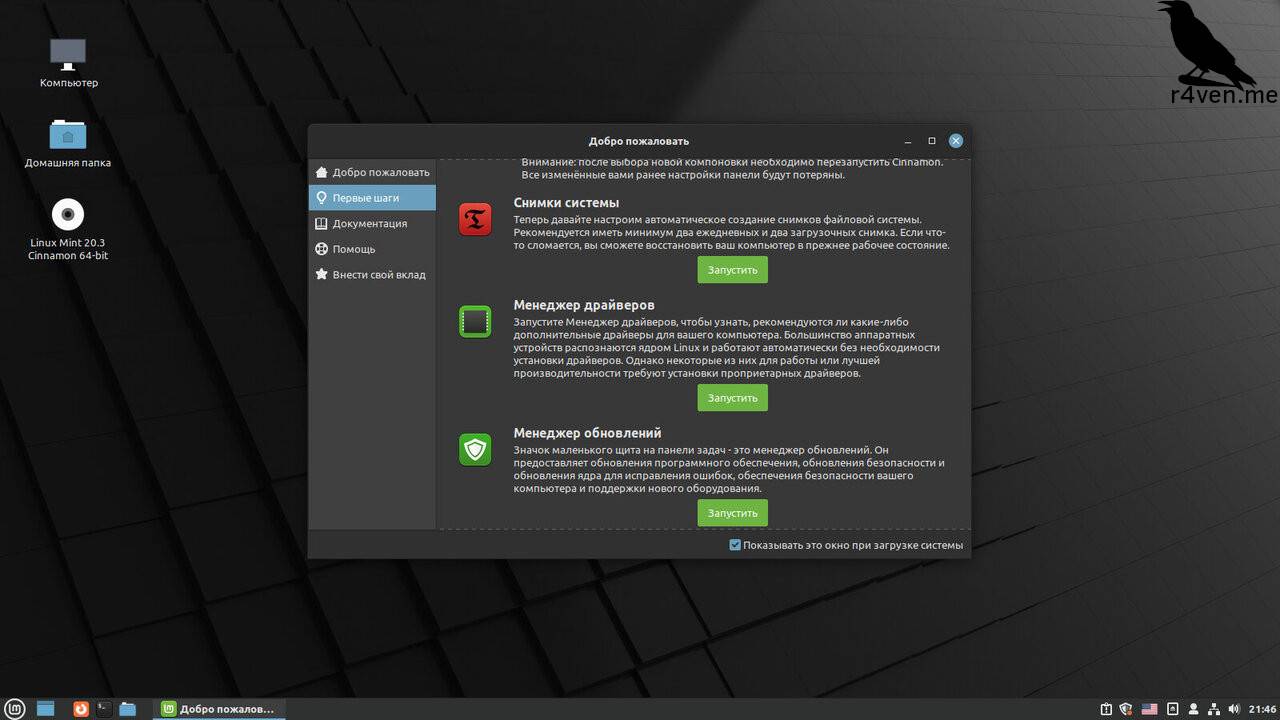 Тут нас встречает приветственное окно, в котором описаны первые шаги и их описание. Например, тут можно изменить базовые настройки внешнего вида системы, запустить менеджер драйверов, который поможет установить видеодрайвера, в случае использования видеокарт от nvidia, или драйвера для не популярного wi-fi оборудования и др.
