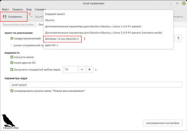 В моём случае я просто изменил настройку «пункт по умолчанию» на «предустановленный» и выбрал в нём Windows. После выбора нужной вам ОС нажимаем кнопку «Сохранить» для внесения изменений в конфигурацию нашего grub загрузчика: