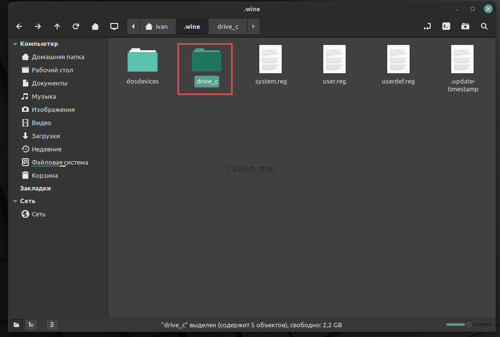 Окружение Wine по умолчанию создаётся в папке /home/username/.wine