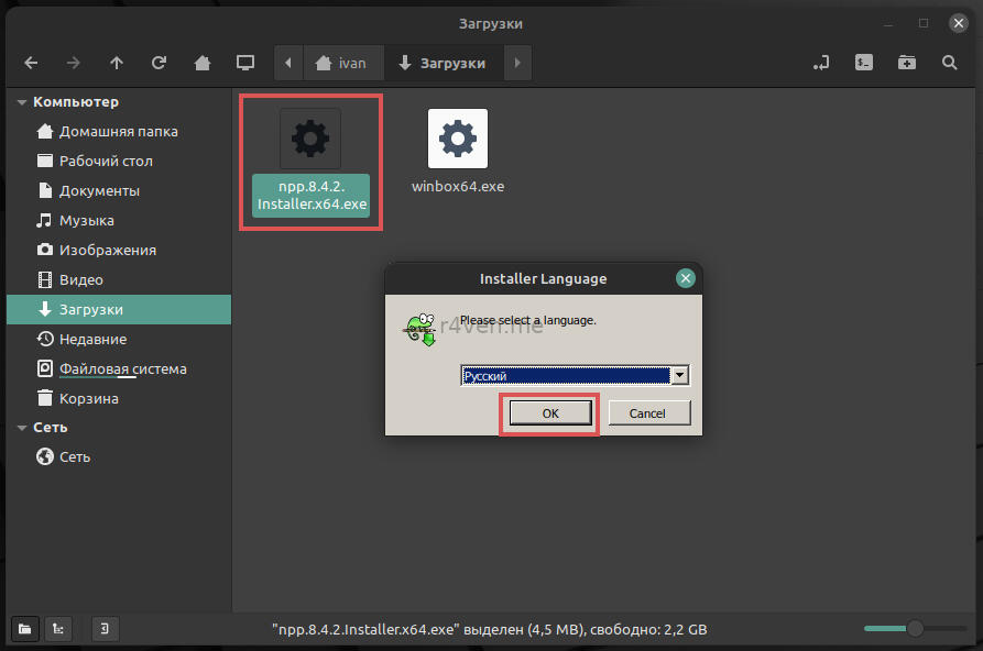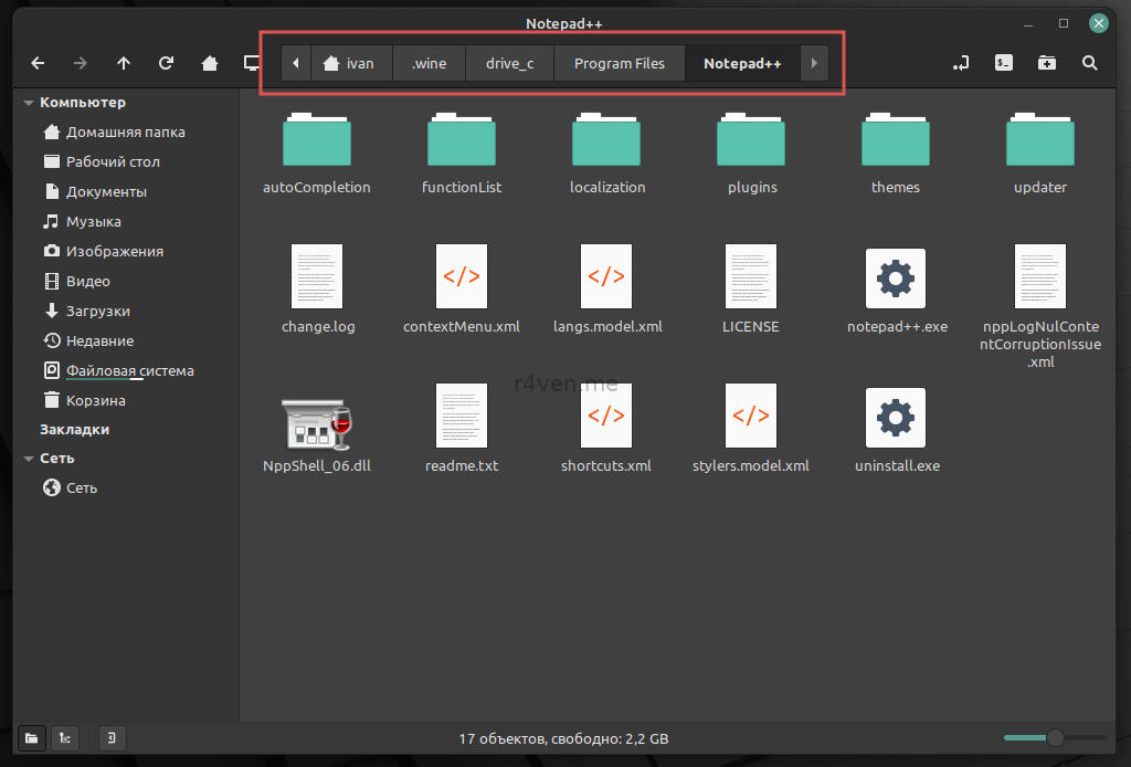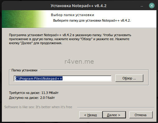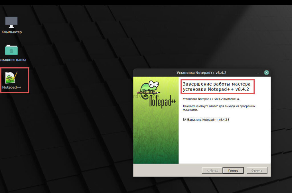 Теперь для демонстрации установим notepad++ и попробуем его запустить. После установки Wine файлы с расширением .exe будут открываться им по умолчанию. Поэтому просто скачиваем нужный exeшник и открываем его в файловом менеджере или через ПКМ —> Открыть с помощью: