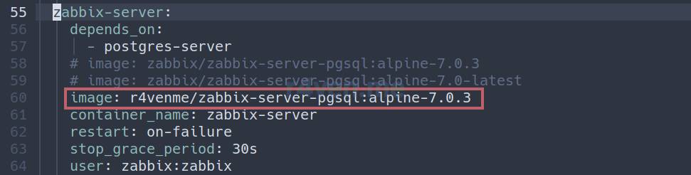 Правим сервис zabbix-server, блок image. Текущую строку комментируем, и расскоменнтирываем строку с адресом собранного мной образа: