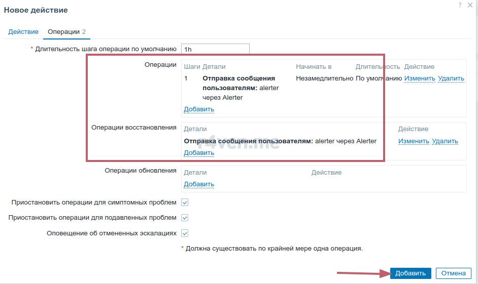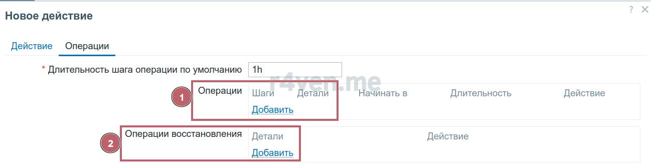 Далее переходим на вкладку «Операции» и там добавляем 2 действия: для «Операции» и «Операции восстановления»: